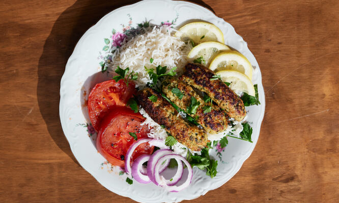 Learn to make kabab tavahi-e morgh (ground chicken kebabs with pan-roasted tomatoes), saffron polo ba tah-dig (basmati rice with saffron and tahdig), and sabsi khordan (a platter of fresh herbs, scallions, and radishes)!